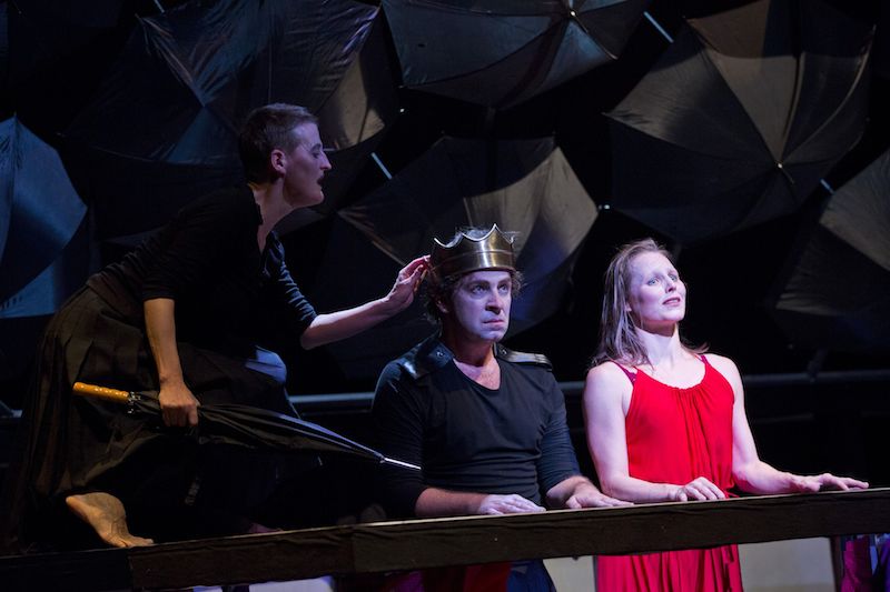schwarze Regenschirme, die an der Decke hängen und als Bühnenrückwand dienen. Zum Schluss, wenn die Wand langsam umkippt,