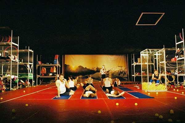 Trampolin und der Schauspieler Guido Wachter unter Beschuss von Tennisbällen.