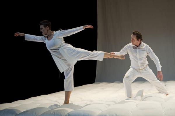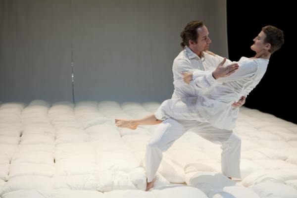 winden sich ganz in Weiß gekleidet in einer schneeweißen Bettenlandschaft.